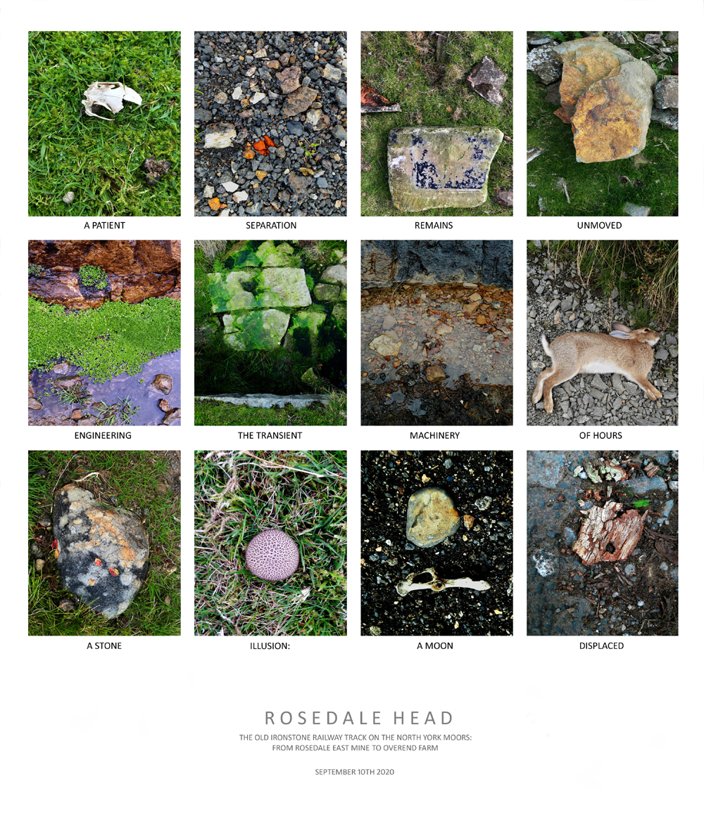 A series of ground images, with words, documenting a walk along the old ironstone railway track on the North York Moors,