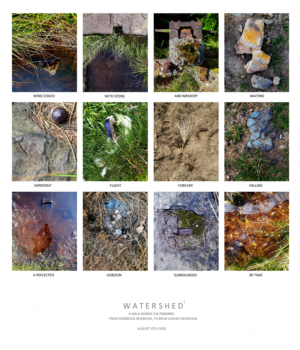 WaterShed A series of ground images, with words, documenting a walk across the Pennine Watershed, from Redbrook Reservoir to Brun Clough Reservoir. 29.7cm x 34cm August 2020