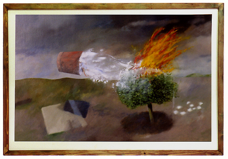 ''Landscape with bucket and burning bush'' Oil and acrylic on wood panel. 71cms x 104cms x 6cms (Private Collection)