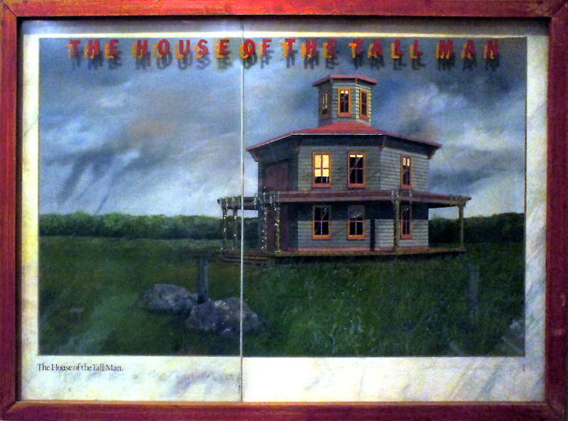''The House Of The Tall Man'' Oil and acrylic on wood panels behind sign-written glass. 56cms x 76cms x 6cms