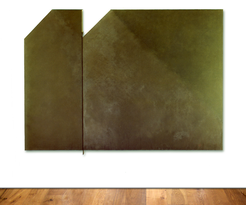 ''Shadow 1'' Earth (above Cymystwyth, Mid Wales) and paint on canvas, with two slate spacers. 140cms x170cms. Two pieces, plus slate.